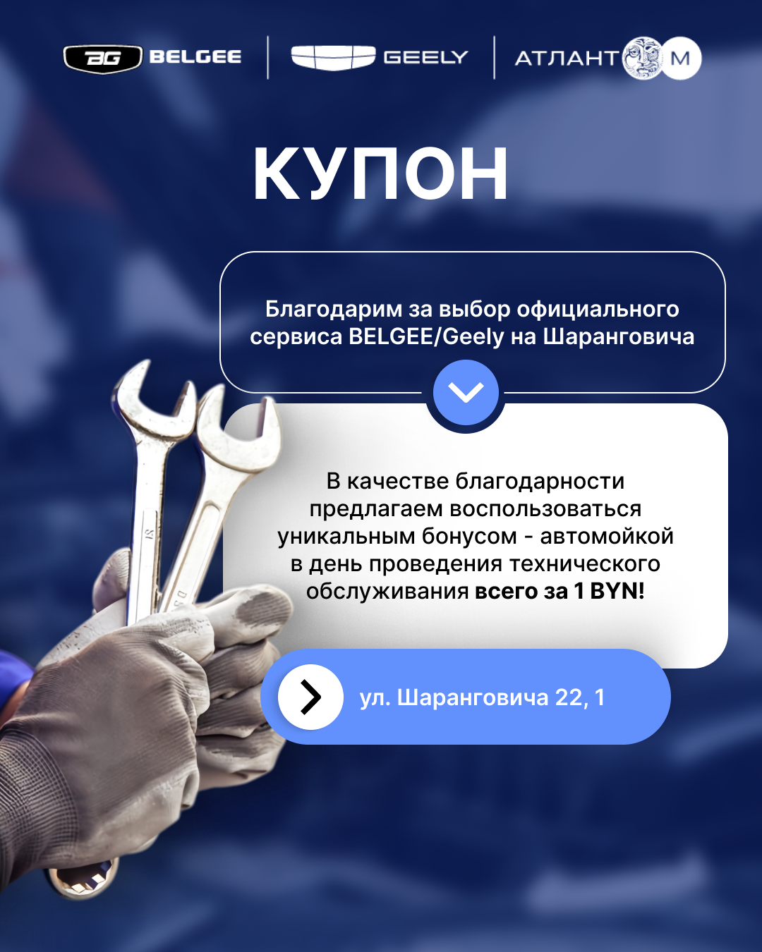 Специальное предложение действует только в официальном сервисном центре Geely и BELGEE Атлант-М по адресу ул. Шаранговича, 22/1.